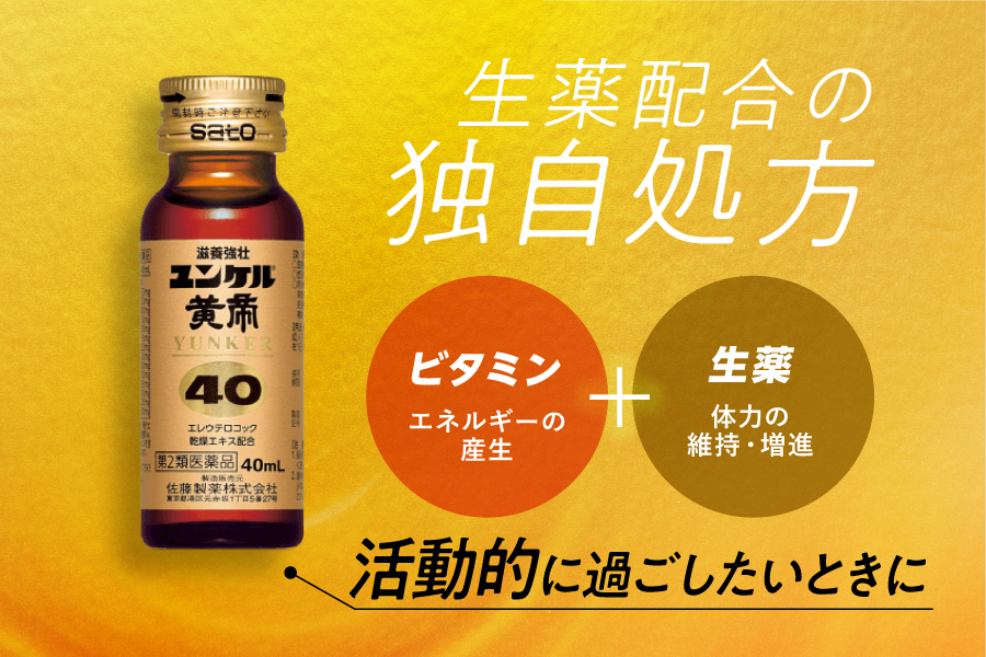 ユンケル黄帝40は、エネルギーの産生をサポートするビタミンに加え、体力を維持・増進させる(滋養強壮)に優れた生薬など14種類の有効成分を配合。