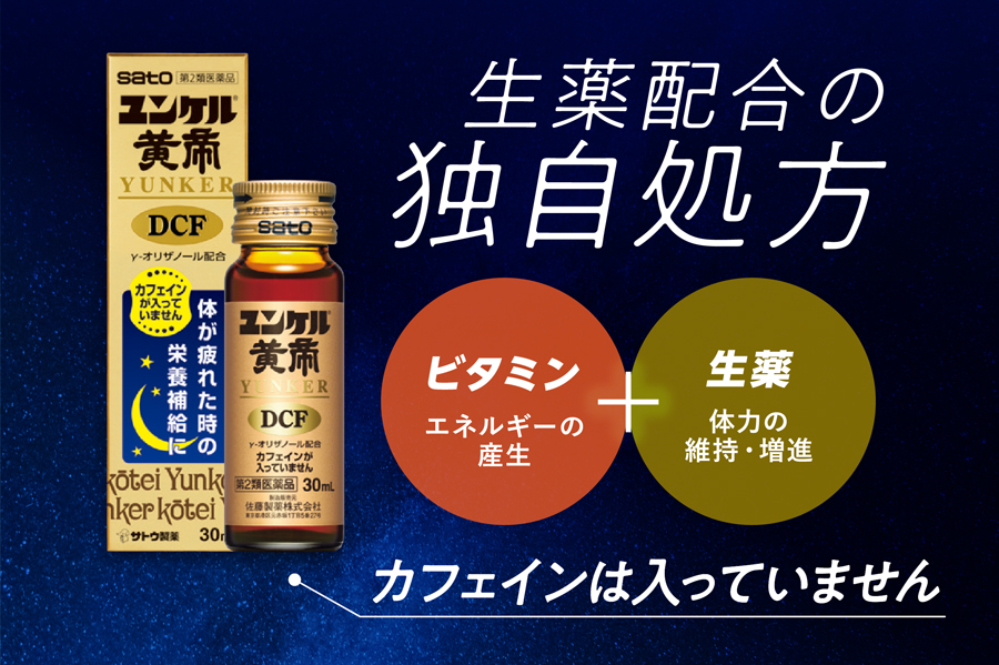 滋養強壮効果の高い”生薬”とエネルギーの産生に欠かせない”ビタミン”を配合した、ユンケル黄帝DCFのための独自処方。